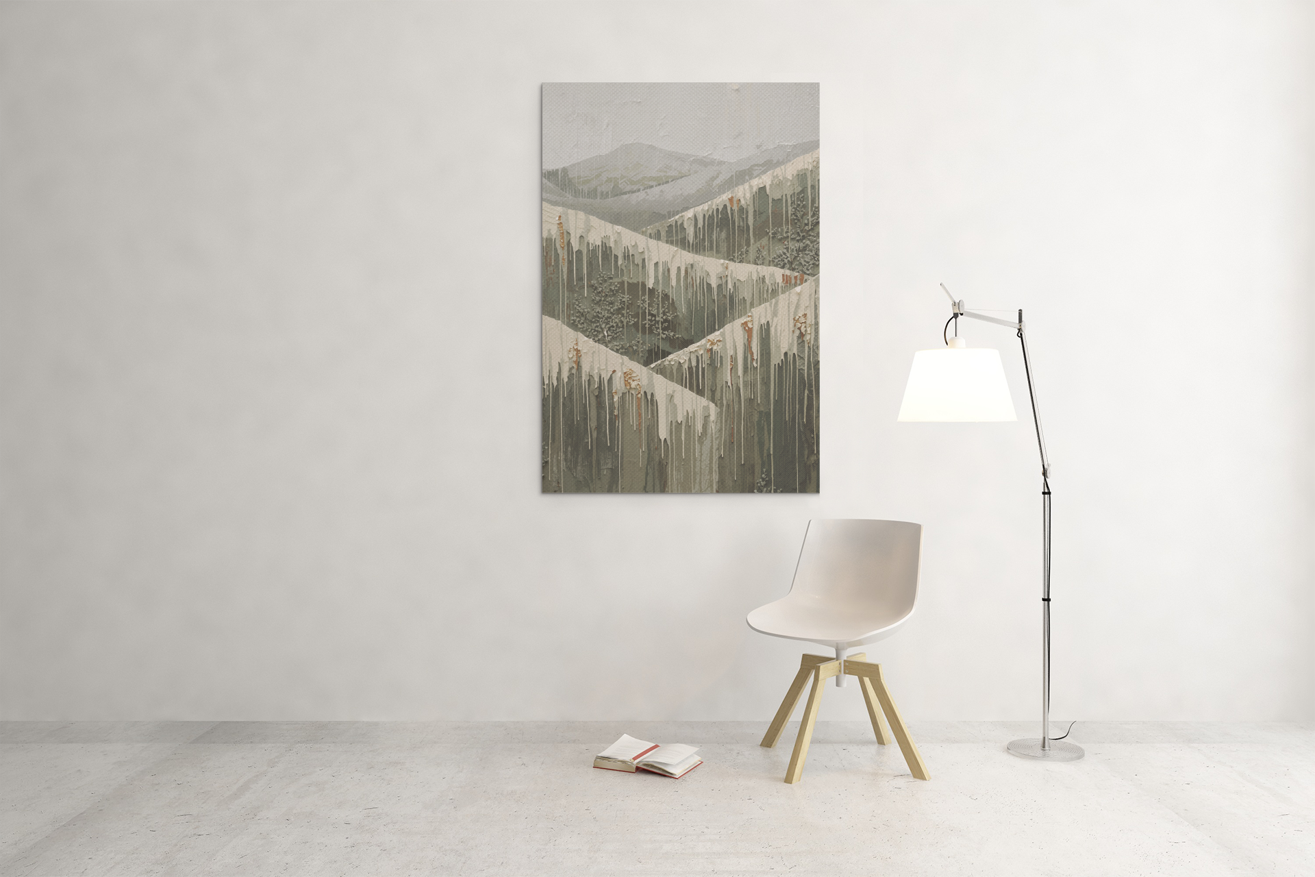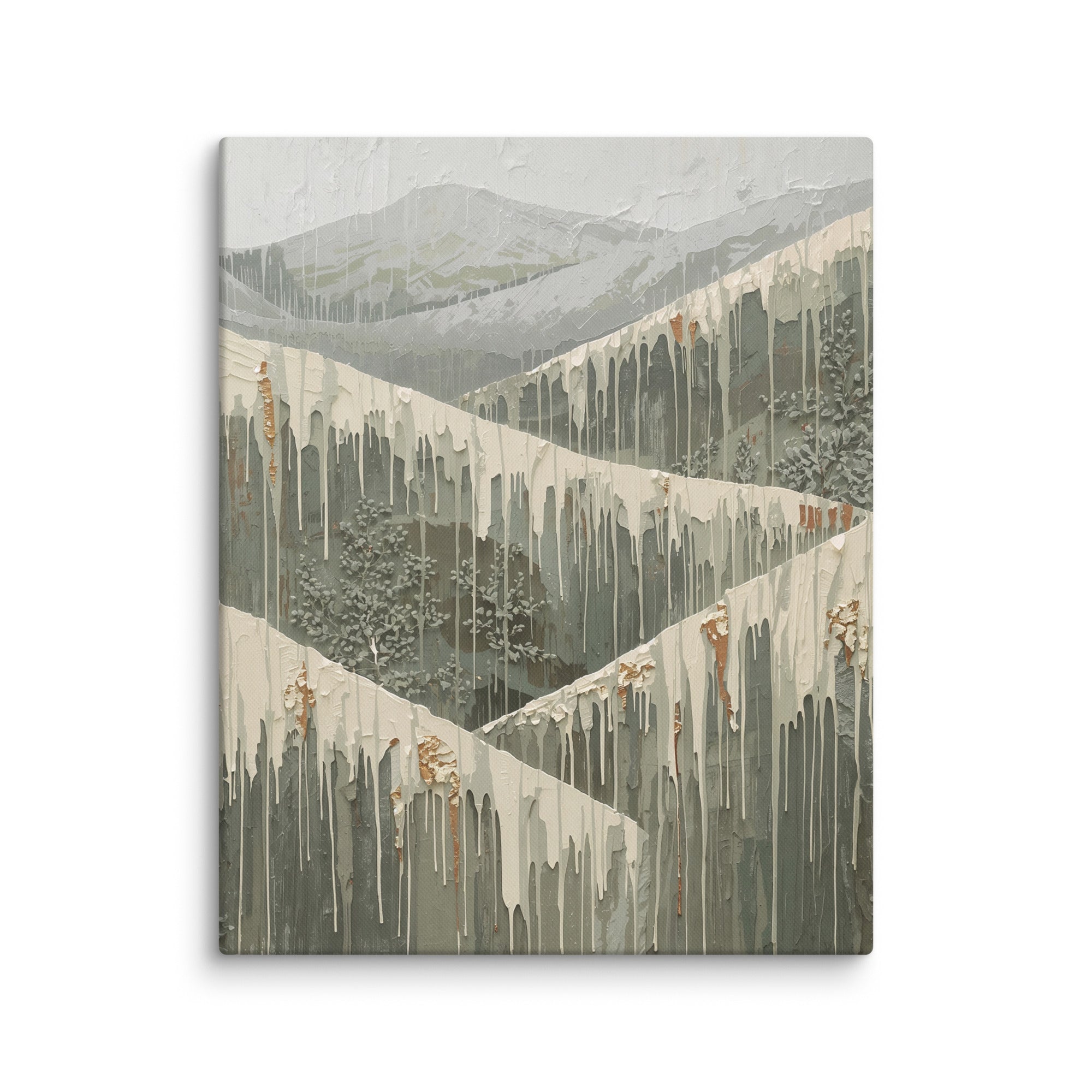Soft sage greens blend with ivory tones as cascading forms flow across sculpted ridges, creating a sense of quiet motion and organic balance. The textured surface evokes the feeling of earth shaped over time, symbolizing growth, resilience, and continuous transformation.