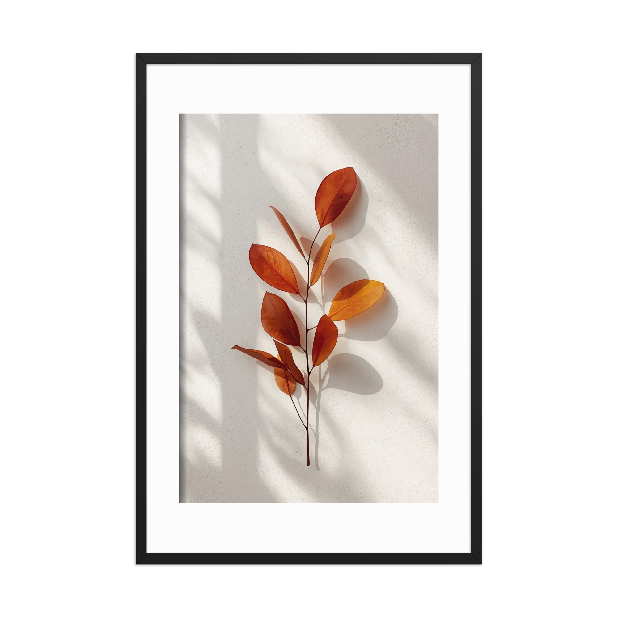 This minimalist botanical framed wall art features rich terracotta leaves illuminated by soft natural light and shadow. The warm tones and clean composition create a calm, inviting atmosphere—perfect for modern, neutral, and Scandinavian interiors.