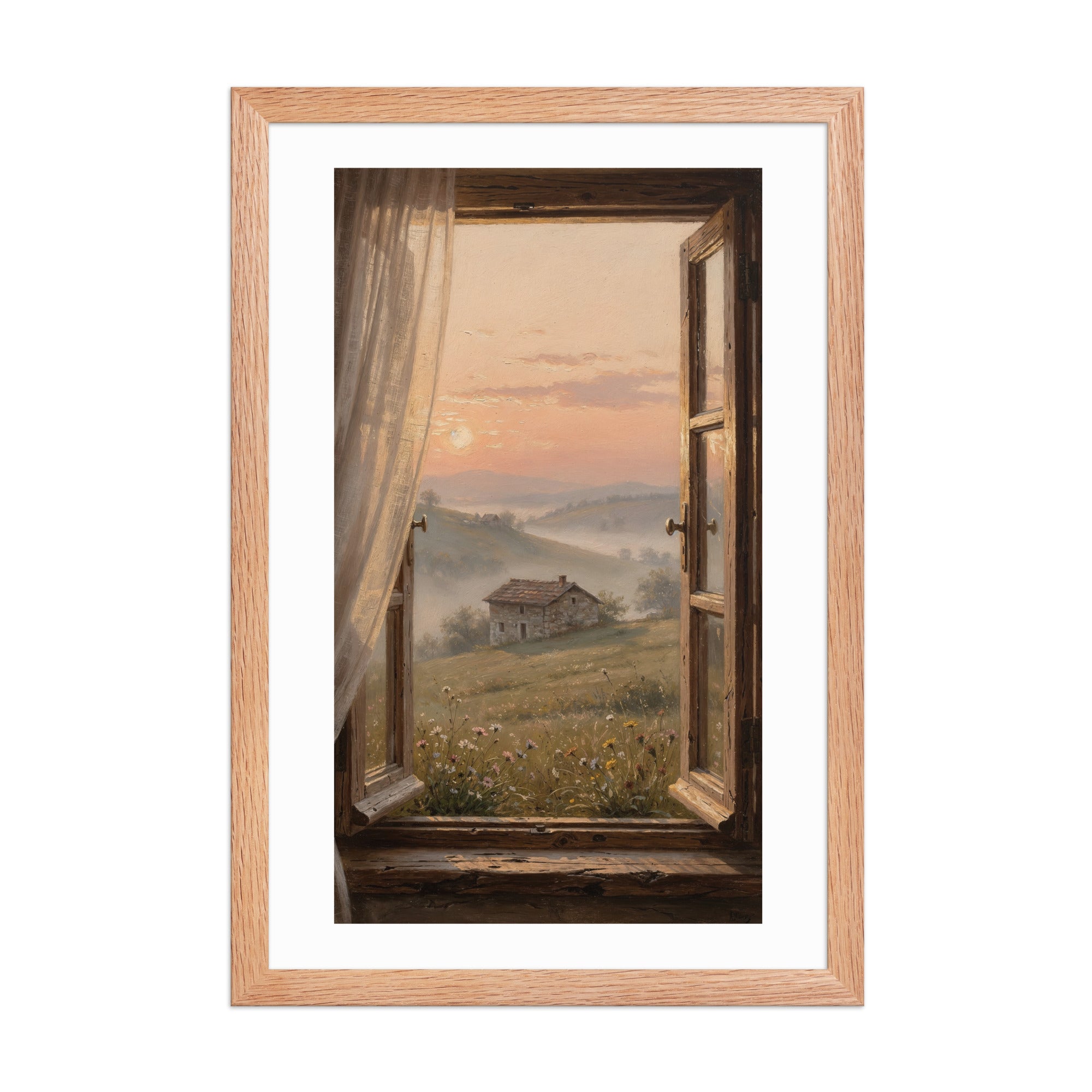 Framed in natural wood, this artwork captures the warmth of sunset viewed through an open window — delicate linen curtains, wildflowers at the sill, and a peaceful countryside fading into atmospheric haze. The refined oil-painting texture and balanced composition create a calming presence in any space.