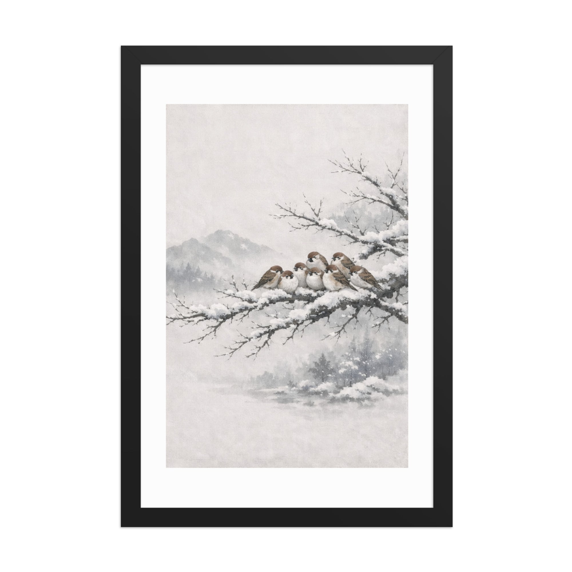 Bring a sense of quiet harmony and warmth into your space with this elegant framed artwork featuring sparrows resting together on a snowy branch.